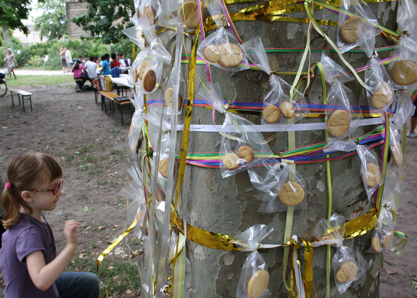 This appetizing installation for a tree features sablés. A catch phrase can be read on each biscuit,from hope to devouring suggestions.