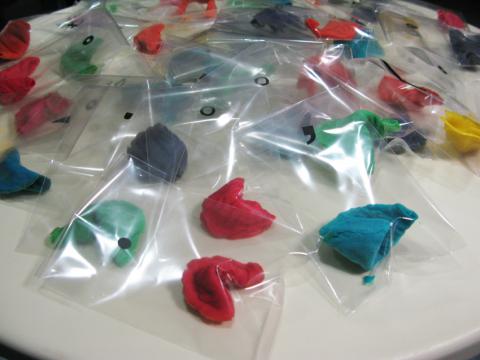 sugar, egg white, flour, butter , food colouring agents, laser prints on paper, plastic bags, stickers.