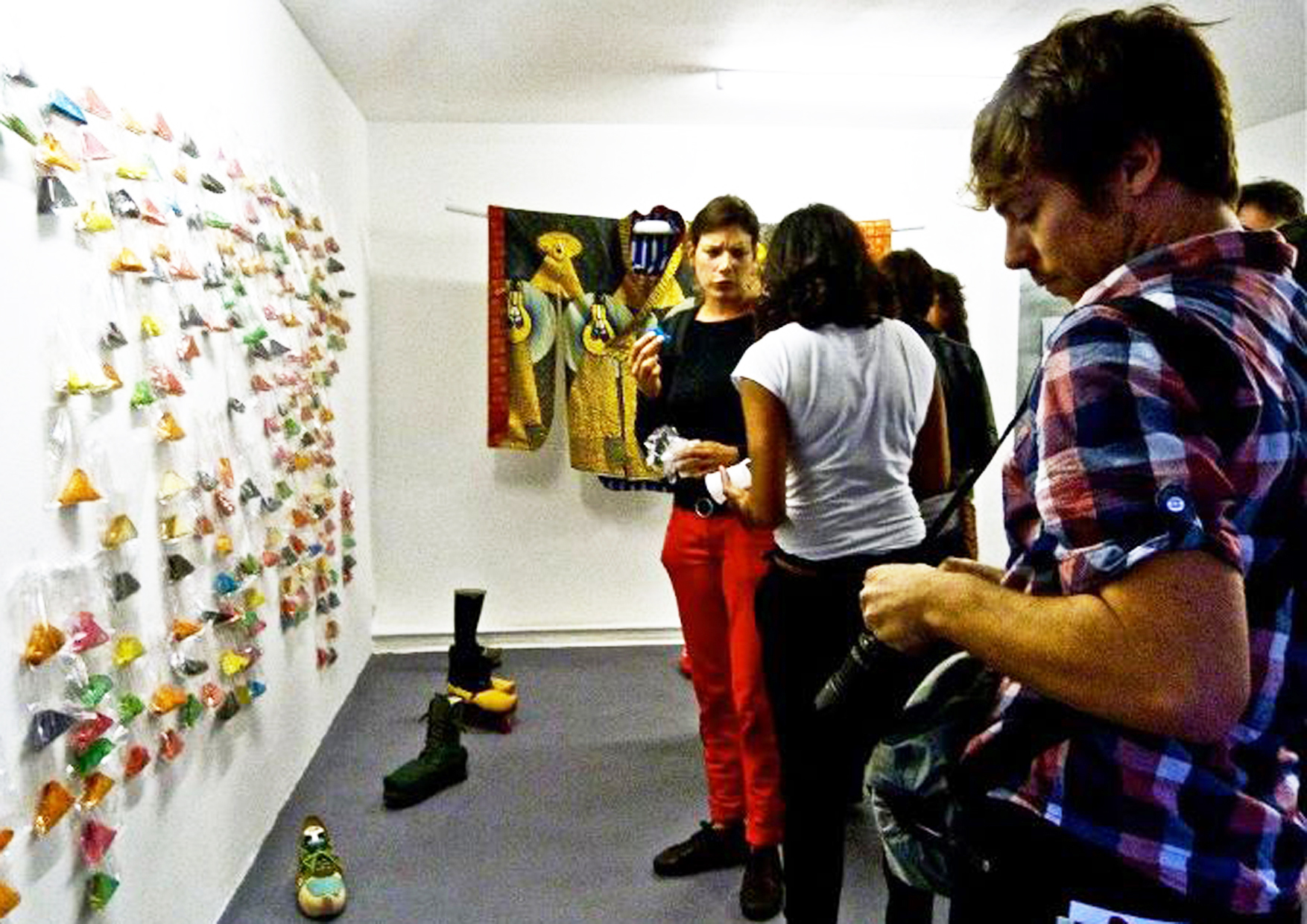 I thought of this culinary installation as a variation on bread, the French symbolic and traditional food. Far from the baguette ham butter sandwich, these small triangle sandwiches powerfully colored, repulsive, intriguants and nevertheless very good become a graphic pattern ready to be savoured. Contained in bags directly Scotch-taped to the wall, they can be take-away such as doggy-bags so thus developing the pattern and the installation, until complete disappearance.