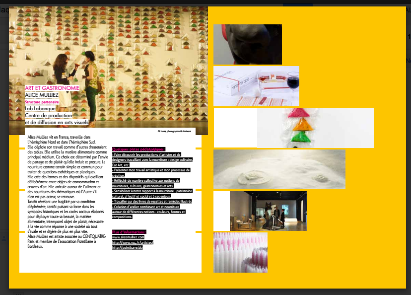 Centre d'art la Chapelle Saint-Jacques, Saint-Gaudens (31) POP UP Invitée par le centre d’art pour une carte blanche sur l’ensemble de la semaine, Alice Mulliez propose des surprises. Avec « POP UP » nom donné à ces multiples interventions, elle s’amuse à ouvrir des fenêtres d’un monde à un autre, tire une ligne qu’elle ponctue d’intervalles ludiques. Fabriquées à base de nourriture, ses oeuvres sont vues comme terrain de partage, de plaisir, socle d’une réflexion sensible et esthétique. Ephémères, ses propositions gourmandes et délicates induisent une douce fragilité relative aux repas de fête vus comme des temps suspendus. Les RENDEZ-VOUS POP UP MARDI 28 février, 19h30 : Soirée surprise au Mooréa en compagnie d’Yvan Poulain, responsable du Musée de Grisolles. VENDREDI 2 mars, 12h : Repas au Rapido, restaurant/snack du lycée professionnel Norbert Casteret. Proposition en partenariat avec le lycée Professionnel Norbert Casteret de St Gaudens. SAMEDI 3 mars, 17h : Goûter/performance à la Communauté de Communes du St Gaudinois pour le dernier rendez-vous de Virtuacité 2012.