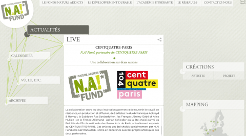http://na-natureaddictsfund.org/#/fr/actualites/live Dans le cadre de ma résidence au CENTQUATRE-Paris, je bénéficie du soutien généreux du Nature-Addicts Fund.