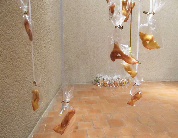 Ainsi il faut se baisser pour récolter les éléments disposés sur la table, et cueillir les merveilles (petits beignets ) réalisés par une amie du musée, accrochés à des rubans de cotillons dorés en une cascade tombant d'une poutre.