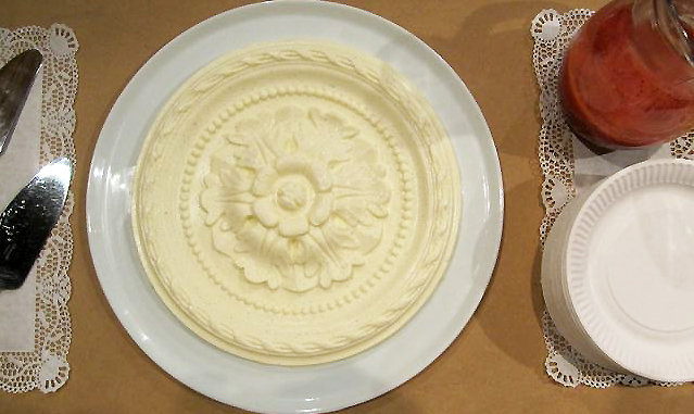 Plus loin, une rosace de plafond s'est transformée en panacotta mêlant ainsi architecture et décor pâtissier.