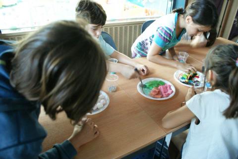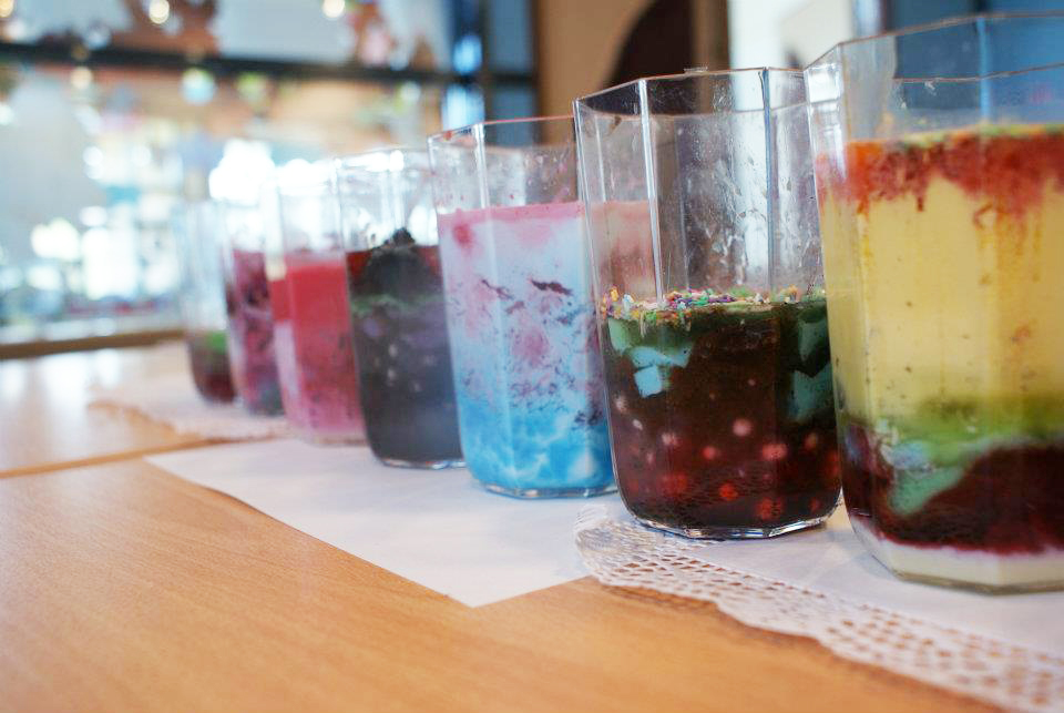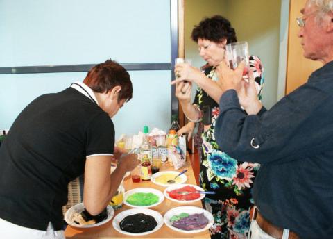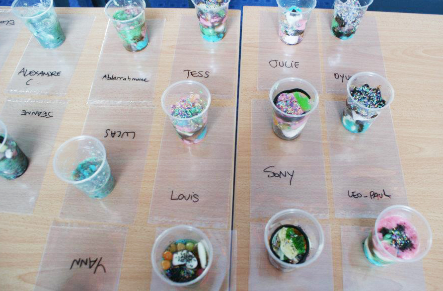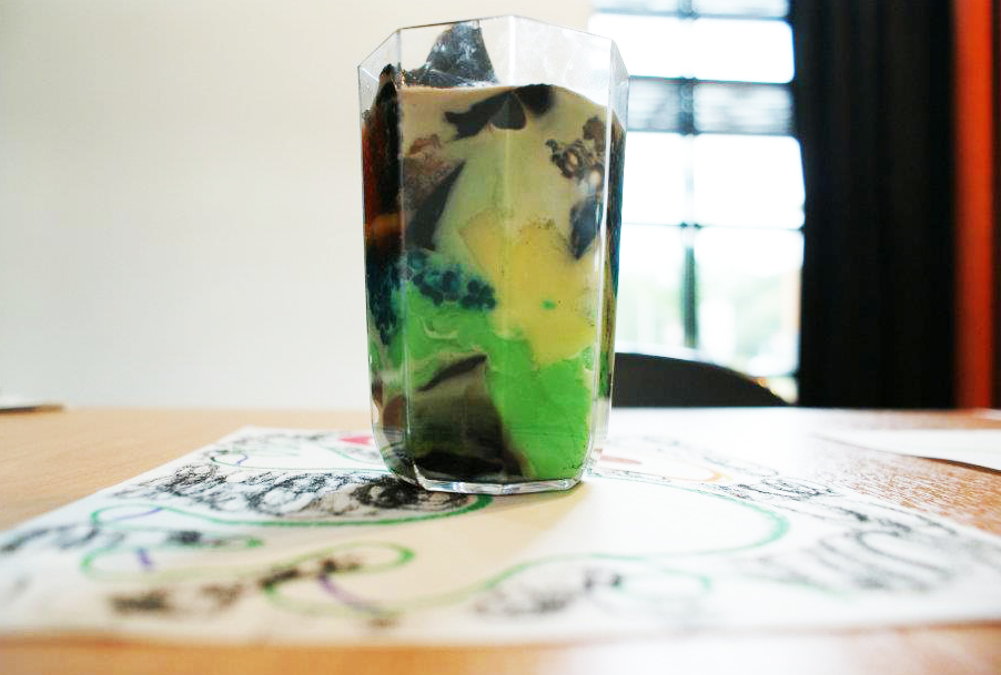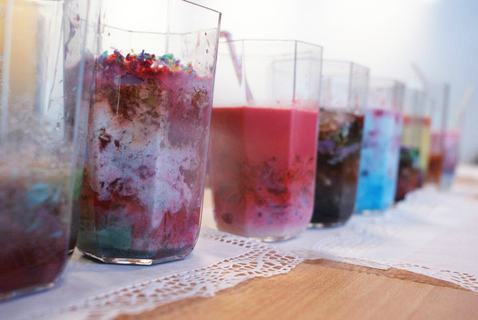 A partir d'additifs alimentaires, de colorants  et de produits non identifiés ( billes de tapioca, lait concentré sucré, jellys, etc...) les participants ont fabriqué de la nourriture non-identifiée: NNI.