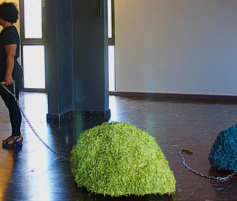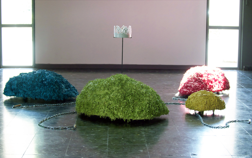 Reliées à des chaînes elles peuvent être déplacées dans l’espace grâce à leurs poignées.