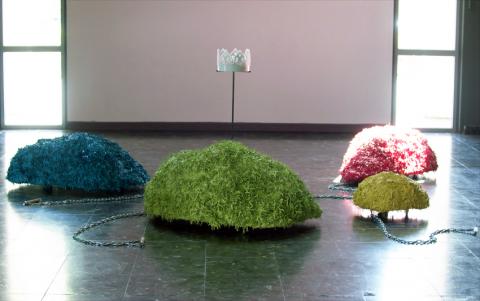 Techniques mixtes, 4 sculptures sur roulettes avec chaîne et poignée.