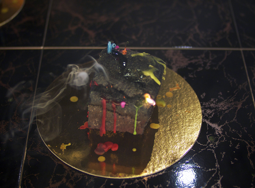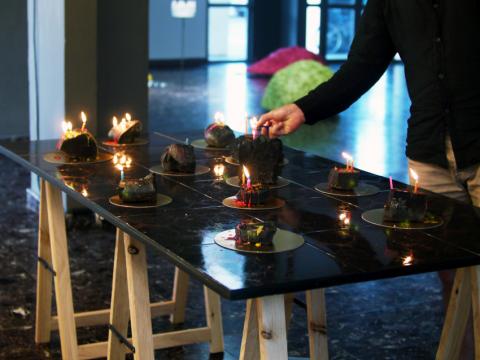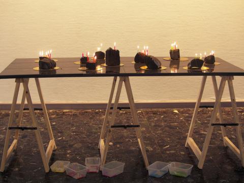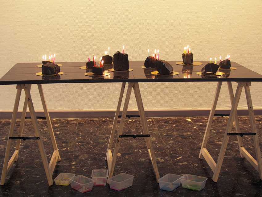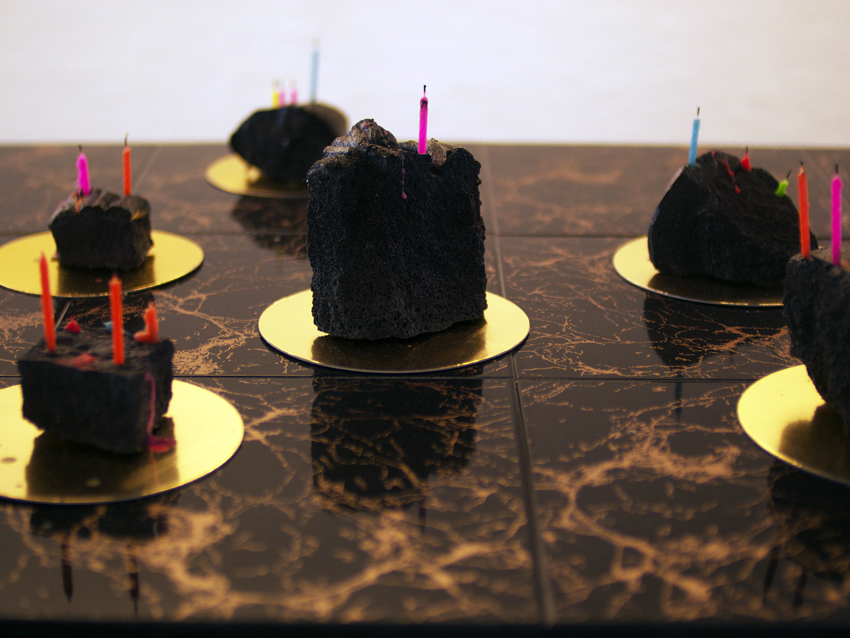 Entre paillasse de laboratoire, table d’observation et table à manger, les pierres/parts se détachent sur leur ronds dorés comme autant d’îlots formant un archipel imaginaire.Basalte, bougies d’anniversaire, ronds dorés de différents diamètres pour pâtisserie, table en carrelage noir et doré, tréteaux.