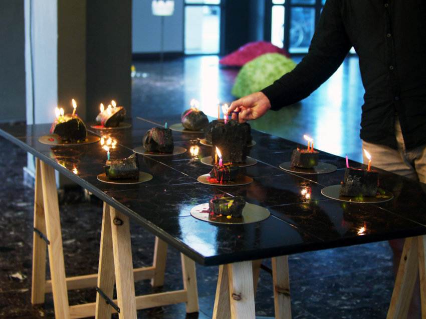 Les bougies d’anniversaire renforcent le jeu et leurs coulées multicolores font penser tour à tour à un autel de Saint-Expédit puis à une table de goûter d’anniversaire.