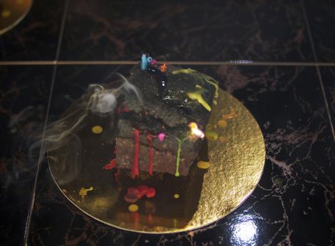 Basalte, bougies d’anniversaire, ronds dorés de différents diamètres pour pâtisserie, table en carrelage noir et doré, tréteaux.