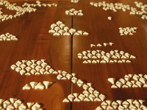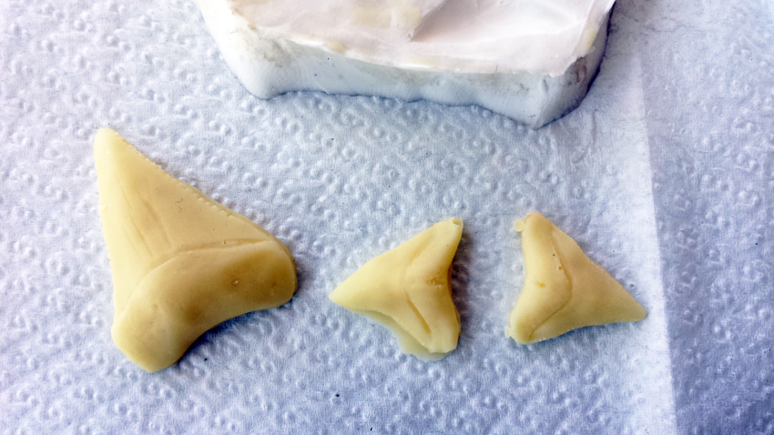 «Des dents de requin en chocolat blanc sur une table forment un motif. L’oeuvre