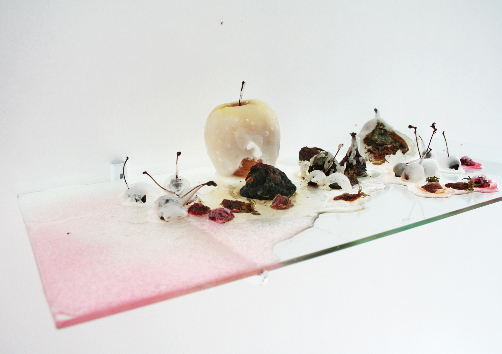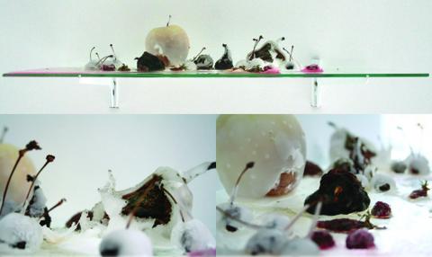 Simplement trempés dans du fondant, des fruits sont agencés en une proposition qui se modifie d’elle-même en fonction du stade de maturation des fruits. Sujet de peinture et de photographie, la nature-morte se transforme ici en une installation vivante mettant en lumière une vie silencieuse, immobile.